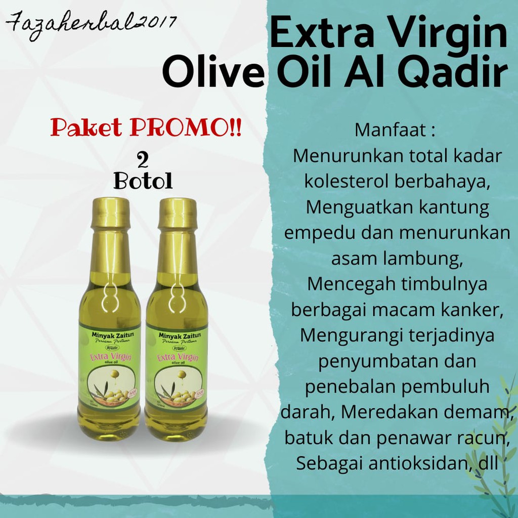 HARGA PROMO 2 Minyak Zaitun 250 ml Extra Virgin Olive Oil Al Qadir dijual oleh toko Fazaherbal2017 dengan lokasi KOTA JAKARTA SELATAN.