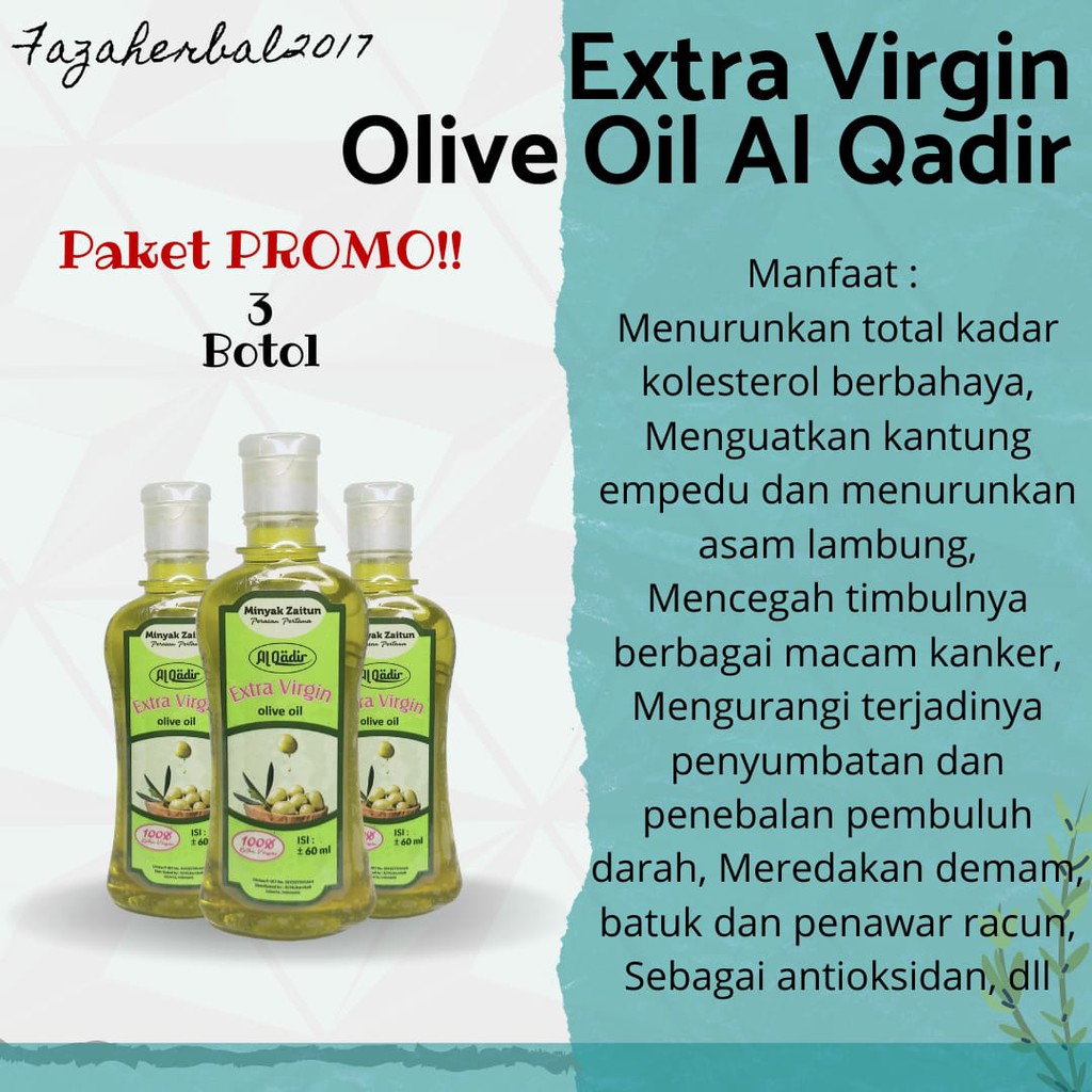 HARGA PROMO 3 Minyak Zaitun 60 ml Extra Virgin Olive Oil Al Qadir dijual oleh toko Fazaherbal2017 yang berlokasi di KOTA JAKARTA SELATAN.